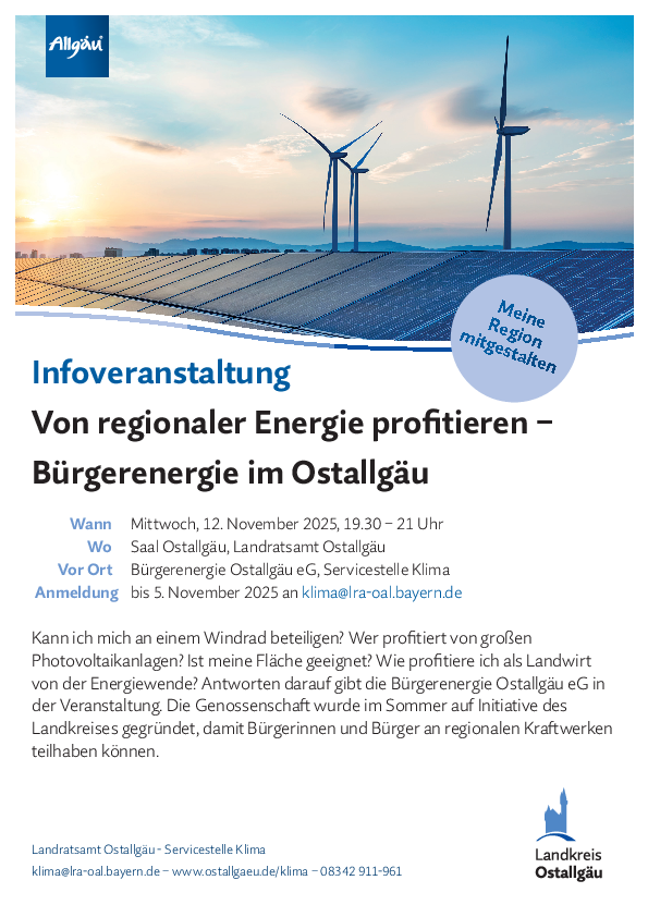 Am Mittwoch, 12. November 2025, von 19:30 bis 21 Uhr, findet im Landratsamt eine Informationsveranstaltung der Bürgerenergie Ostallgäu eG und der Servicestelle Klima statt. Interessierte erfahren dort, wie sie sich an Windkraft- und Photovoltaikanlagen beteiligen und von der Energiewende vor Ort profitieren können. Die kürzlich gegründete Genossenschaft ermöglicht Bürgerinnen und Bürgern die Teilhabe an regionalen Kraftwerken. Ehrenamtliche Genossenschaftsmitglieder stehen für Fragen zur Verfügung. Anmeldung bis 5. November 2025 an klima@lra-oal.bayern.de.