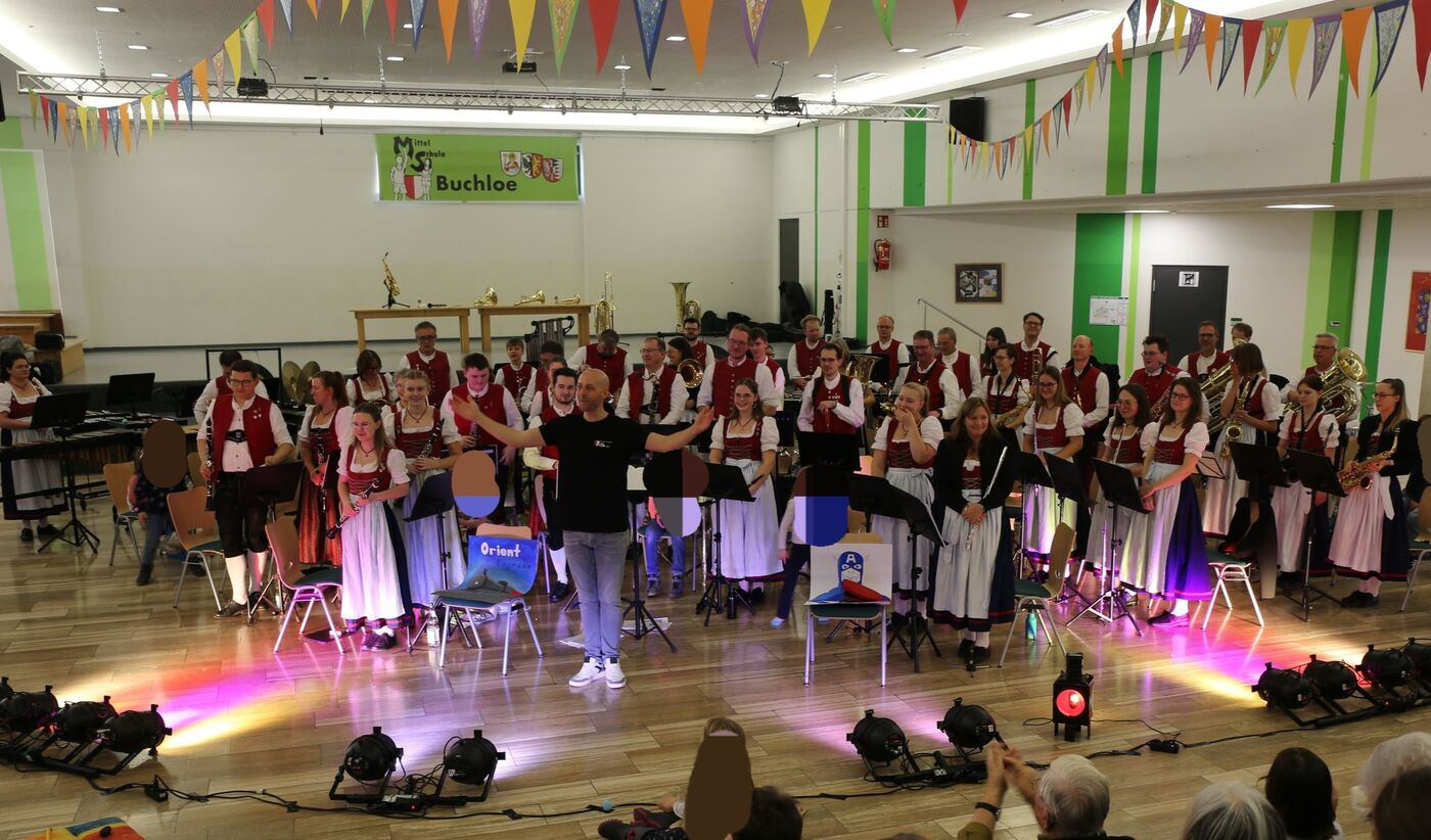Stefan Reggel (Dirigent und Musikpädagoge) und das Blasorchester der Stadtkapelle Buchloe führen Ausschnitte aus dem aktuellen Konzertprogramm kindgerecht auf.