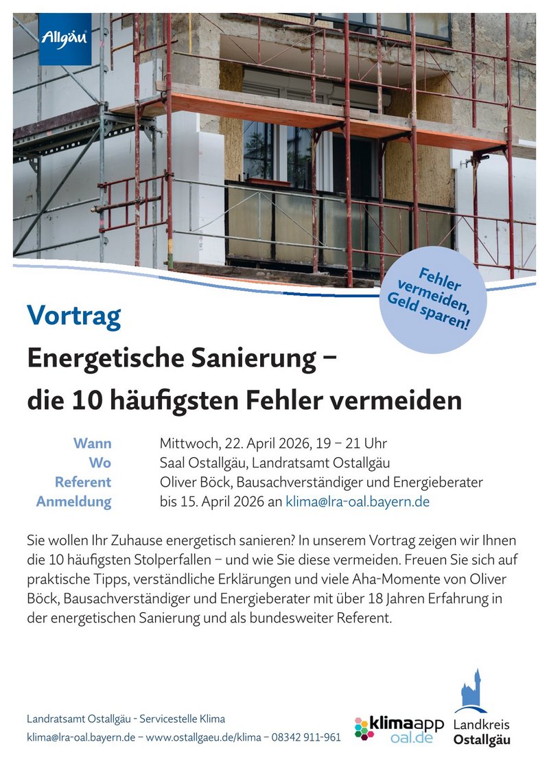 lädt das Landratsamt Ostallgäu zu einem Vortrag zum Thema „Energetische Sanierung – die 10 häufigsten Fehler vermeiden“ in den Saal Ostallgäu ein. Der Bausachverständige und Energieberater Oliver Böck zeigt anschaulich die typischen Stolperfallen bei der energetischen Sanierung und erklärt verständlich, wie Sie diese vermeiden und Ihr Zuhause fit für die Zukunft machen. Freuen Sie sich auf praxisnahe Tipps, klare Erklärungen und viele Aha-Momente rund um die energetische Modernisierung. Eine Anmeldung ist bis zum 15. April 2026 per E-Mail an klima@lra-oal.bayern.de erforderlich.
