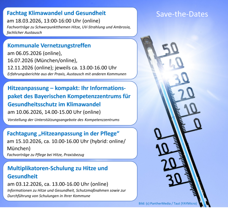 das Bayerische Kompetenzzentrum für Gesundheitsschutz im Klimawandel am Bayerischen Landesamt für Gesundheit und Lebensmittelsicherheit (LGL) bietet auch dieses Jahr wieder eine Vielzahl kostenloser Veranstaltungen rund um die gesundheitlichen Auswirkungen des Klimawandels an.