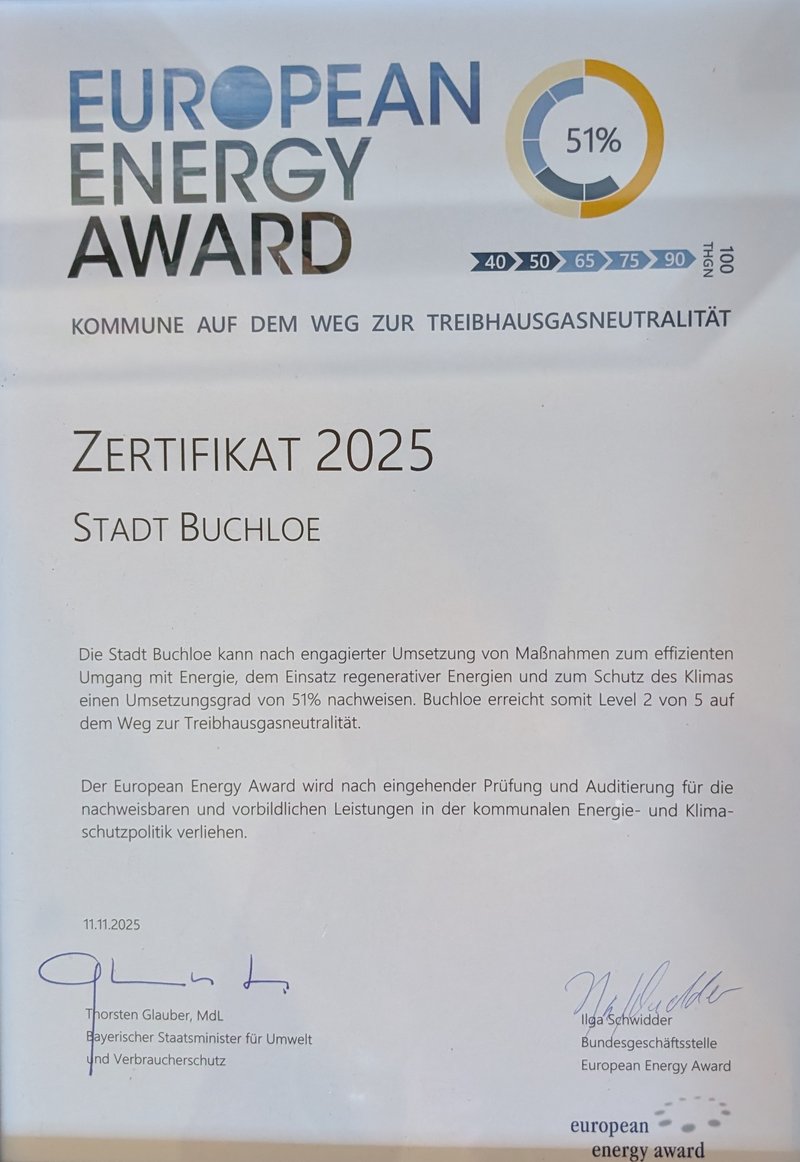 Nach 4-jähriger Teilnahme der Stadtverwaltung am Klimaschutz-Management-Prozess European Energy Award wurde die Stadt in einem externen Audit zur EEA-Klimaschutz-Kommune zertifiziert. Buchloe gehört damit zu den 242 Kommunen mit eea-Auszeichnung in Deutschland (Stand 2025: europaweit 1872 teilnehmende Kommunen, deutschlandweit über 300 (Städte, Gemeinden Landkreise)